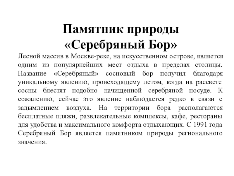 одним из популярнейших мест отдыха в пределах столицы. Название «Серебряный» сосновый бор получил благодаря уникальному явлению, происходящему летом, когда на рассвете сосны блестят подобно начищенной серебряной посуде. К сожалению, сейчас это явление наблюдается редко в связи с задымлением воздуха. На территории бора располагаются бесплатные пляжи, развлекательные комплексы, кафе, рестораны для удобства и максимального комфорта отдыхающих. С 1991 года Серебряный Бор является памятником природы регионального значения.
