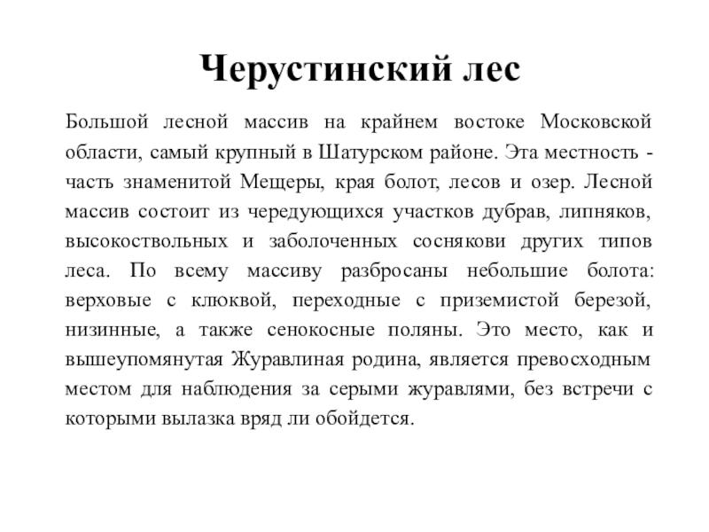 в Шатурском районе. Эта местность - часть знаменитой Мещеры, края болот, лесов и озер. Лесной массив состоит из чередующихся участков дубрав, липняков, высокоствольных и заболоченных соснякови других типов леса. По всему массиву разбросаны небольшие болота: верховые с клюквой, переходные с приземистой березой, низинные, а также сенокосные поляны. Это место, как и вышеупомянутая Журавлиная родина, является превосходным местом для наблюдения за серыми журавлями, без встречи с которыми вылазка вряд ли обойдется.