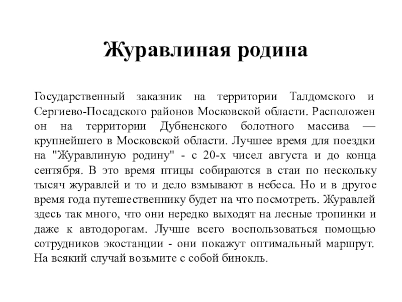 Расположен он на территории Дубненского болотного массива — крупнейшего в Московской области. Лучшее время для поездки на "Журавлиную родину" - с 20-х чисел августа и до конца сентября. В это время птицы собираются в стаи по нескольку тысяч журавлей и то и дело взмывают в небеса. Но и в другое время года путешественнику будет на что посмотреть. Журавлей здесь так много, что они нередко выходят на лесные тропинки и даже к автодорогам. Лучше всего воспользоваться помощью сотрудников экостанции - они покажут оптимальный маршрут. На всякий случай возьмите с собой бинокль.