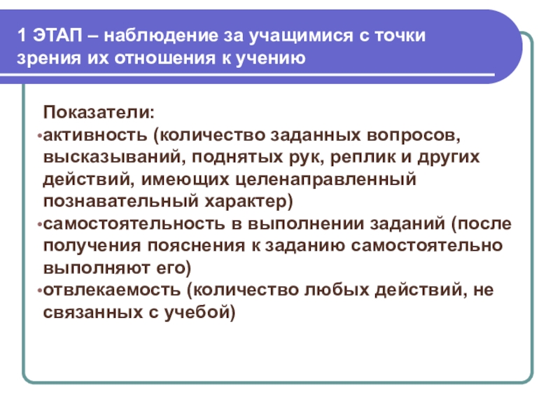 активность (количество заданных вопросов, высказываний, поднятых рук, реплик и других действий, имеющих целенаправленный познавательный характер)