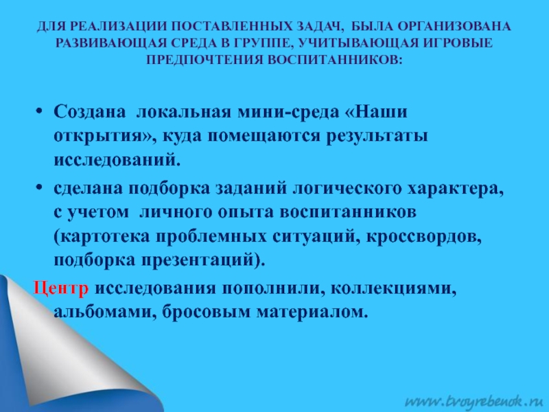 Слайд 17Для реализации поставленных задач, была организована развивающая среда в группе, учитывающая