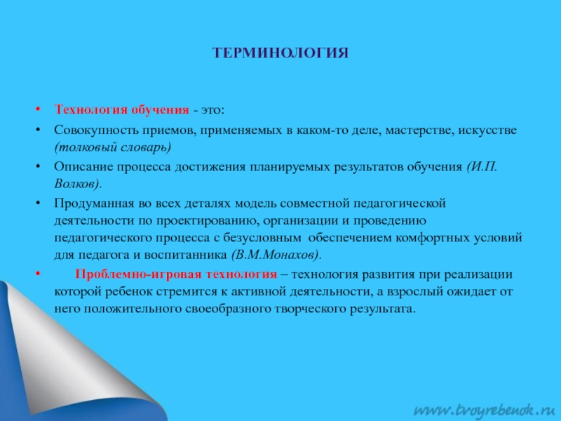 Проблемно-игровая технология – технология развития при реализации которой ребенок стремится к активной деятельности, а взрослый ожидает от него положительного своеобразного творческого результата.