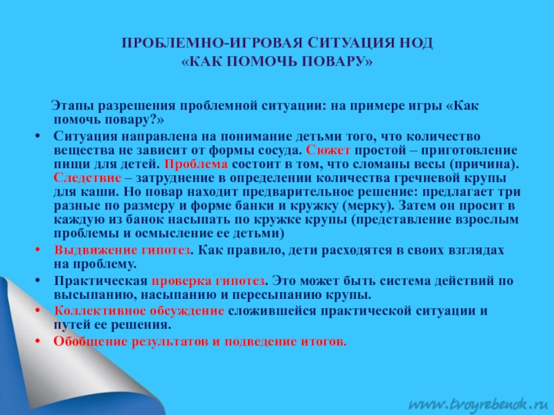 Ситуация направлена на понимание детьми того, что количество вещества не зависит от формы сосуда. Сюжет простой – приготовление пищи для детей. Проблема состоит в том, что сломаны весы (причина). Следствие – затруднение в определении количества гречневой крупы для каши. Но повар находит предварительное решение: предлагает три разные по размеру и форме банки и кружку (мерку). Затем он просит в каждую из банок насыпать по кружке крупы (представление взрослым проблемы и осмысление ее детьми)