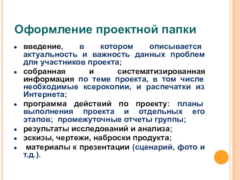 собранная и систематизированная информация по теме проекта, в том числе необходимые ксерокопии, и распечатки из Интернета;