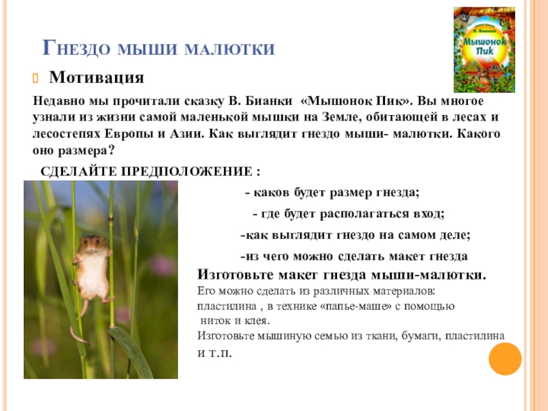 Недавно мы прочитали сказку В. Бианки «Мышонок Пик». Вы