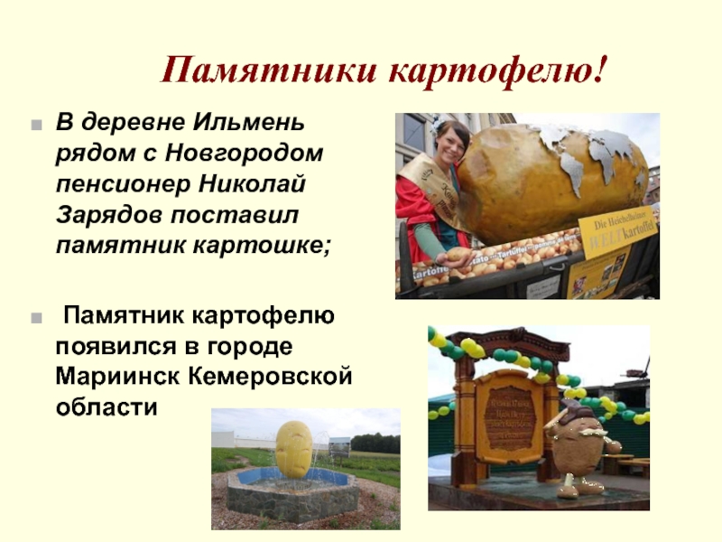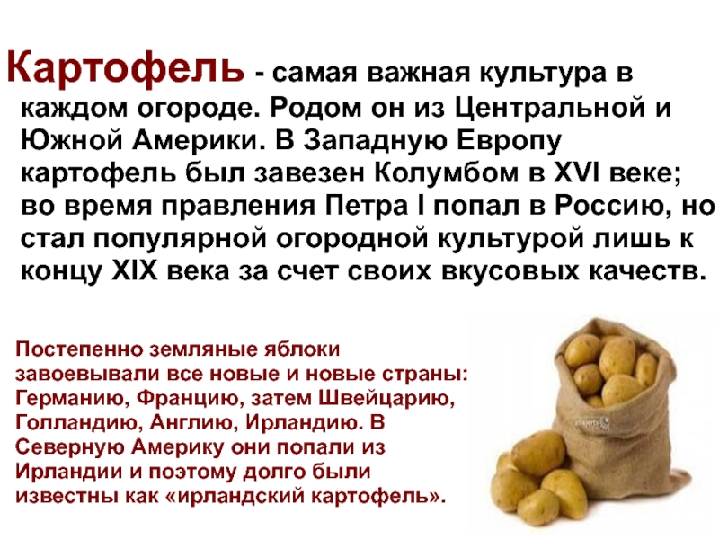 Постепенно земляные яблоки завоевывали все новые и новые страны: Германию, Францию, затем Швейцарию, Голландию, Англию, Ирландию. В Северную Америку они попали из Ирландии и поэтому долго были известны как «ирландский картофель».