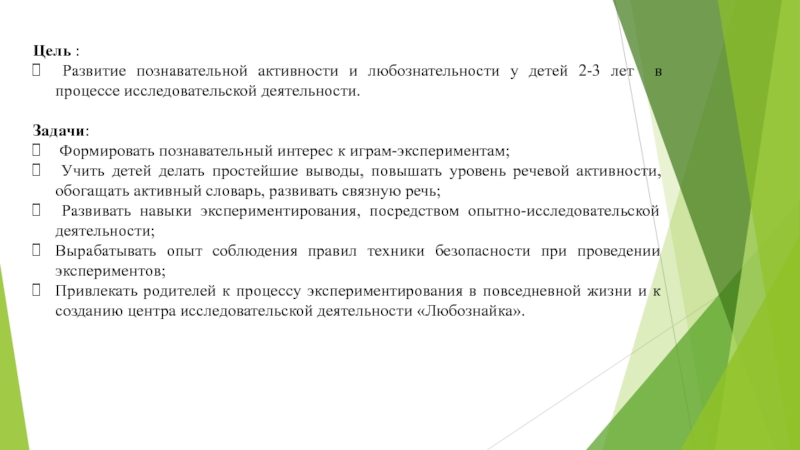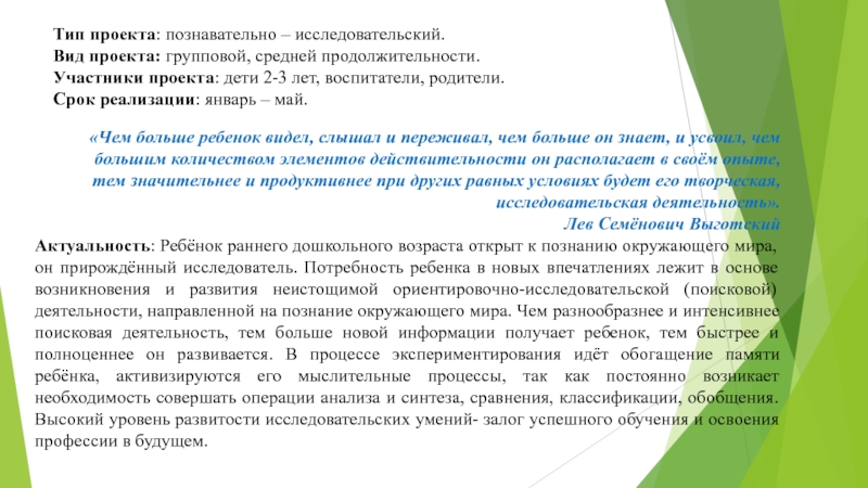 Актуальность: Ребёнок раннего дошкольного возраста открыт к познанию окружающего мира, он прирождённый исследователь. Потребность ребенка в новых впечатлениях лежит в основе возникновения и развития неистощимой ориентировочно-исследовательской (поисковой) деятельности, направленной на познание окружающего мира. Чем разнообразнее и интенсивнее поисковая деятельность, тем больше новой информации получает ребенок, тем быстрее и полноценнее он развивается. В процессе экспериментирования идёт обогащение памяти ребёнка, активизируются его мыслительные процессы, так как постоянно возникает необходимость совершать операции анализа и синтеза, сравнения, классификации, обобщения. Высокий уровень развитости исследовательских умений- залог успешного обучения и освоения профессии в будущем.