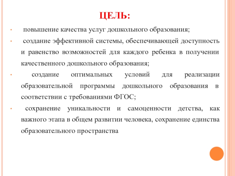 равенство возможностей для каждого ребенка в получении качественного дошкольного образования;