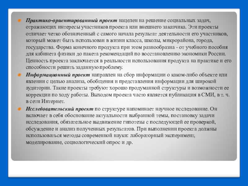 Практико-ориентированный проект нацелен на решение социальных задач, отражающих интересы участников проекта