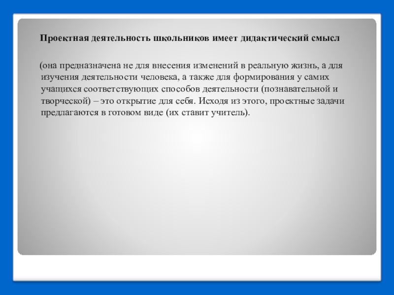 (она предназначена не для внесения изменений в реальную жизнь, а для изучения деятельности человека, а также для формирования у самих учащихся соответствующих способов деятельности (познавательной и творческой) – это открытие для себя. Исходя из этого, проектные задачи предлагаются в готовом виде (их ставит учитель).