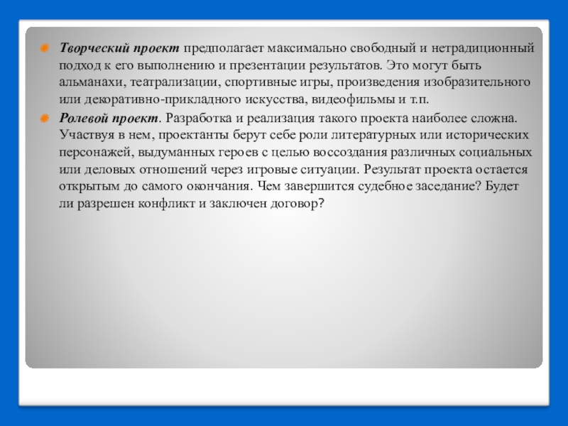 Ролевой проект. Разработка и реализация такого проекта наиболее сложна. Участвуя в нем, проектанты берут себе роли литературных или исторических персонажей, выдуманных героев с целью воссоздания различных социальных или деловых отношений через игровые ситуации. Результат проекта остается открытым до самого окончания. Чем завершится судебное заседание? Будет ли разрешен конфликт и заключен договор?