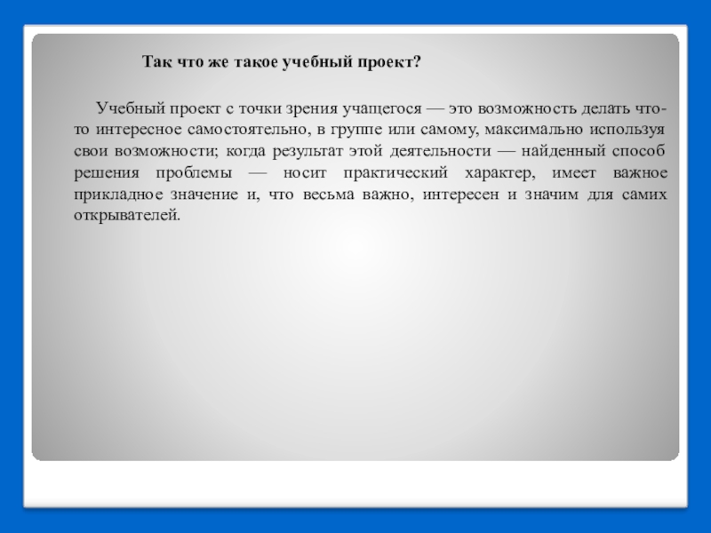 Учебный проект с точки зрения учащегося — это возможность делать что-то интересное самостоятельно, в группе или самому, максимально используя свои возможности; когда результат этой деятельности — найденный способ решения проблемы — носит практический характер, имеет важное прикладное значение и, что весьма важно, интересен и значим для самих открывателей.
