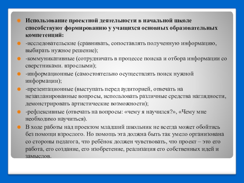 Использование проектной деятельности в начальной школе способствуют формированию у учащихся основных