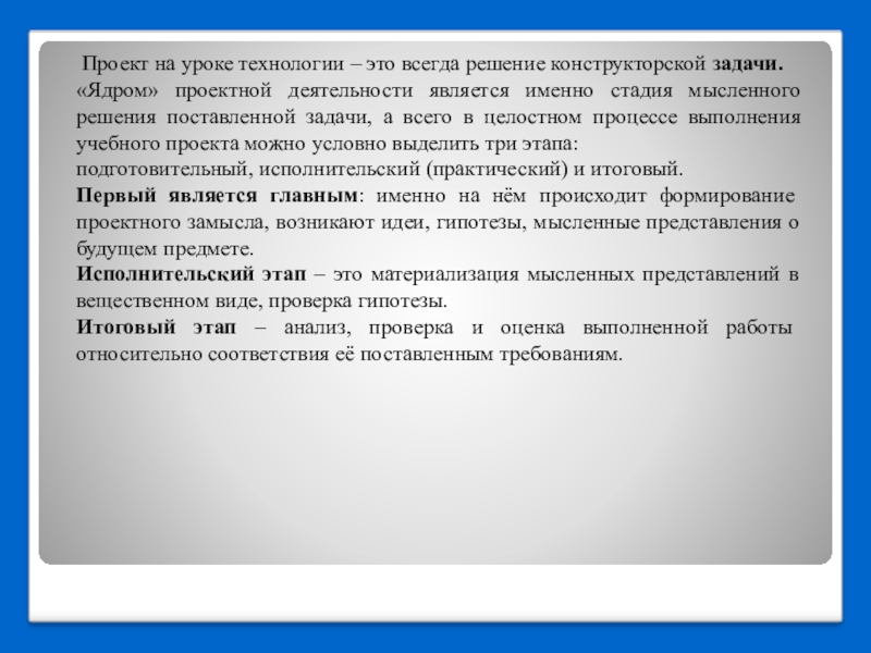 «Ядром» проектной деятельности является именно стадия мысленного решения поставленной задачи, а всего в целостном процессе выполнения учебного проекта можно условно выделить три этапа: