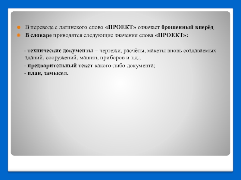 В переводе с латинского слово «ПРОЕКТ» означает брошенный вперёд