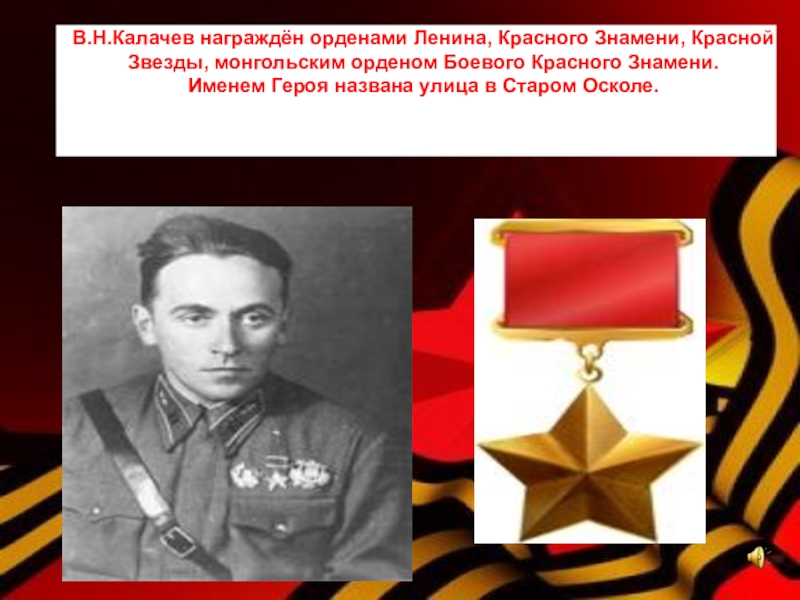 Слайд 14В.Н.Калачев награждён орденами Ленина, Красного Знамени, Красной Звезды, монгольским орденом Боевого