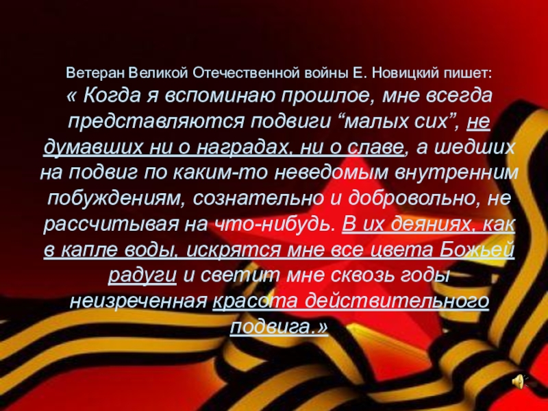Слайд 4Ветеран Великой Отечественной войны Е. Новицкий пишет: