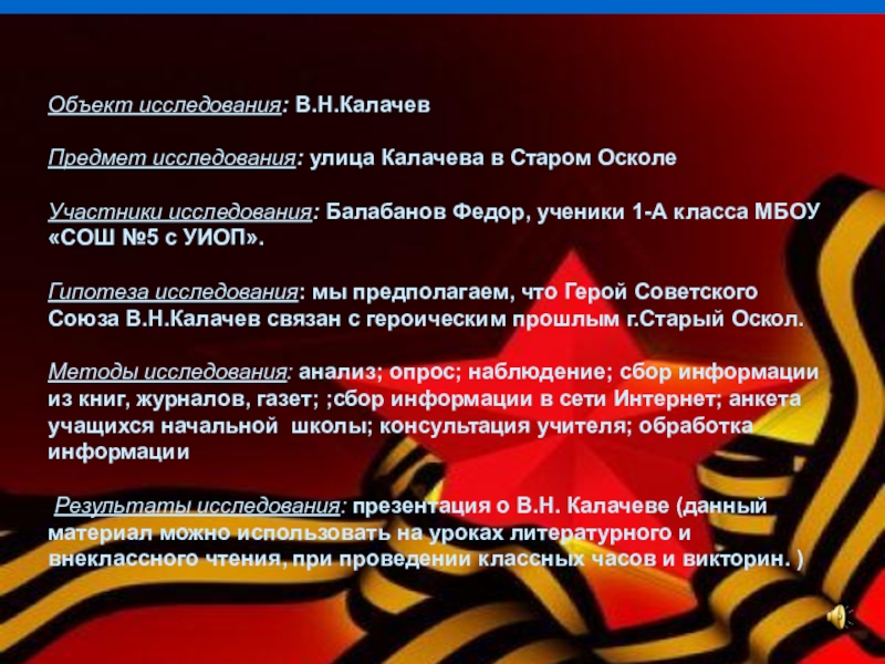Гипотеза исследования: мы предполагаем, что Герой Советского Союза В.Н.Калачев связан с героическим прошлым г.Старый Оскол.