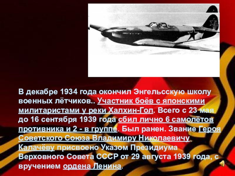 Слайд 12В декабре 1934 года окончил Энгельсскую школу военных лётчиков.. Участник боёв