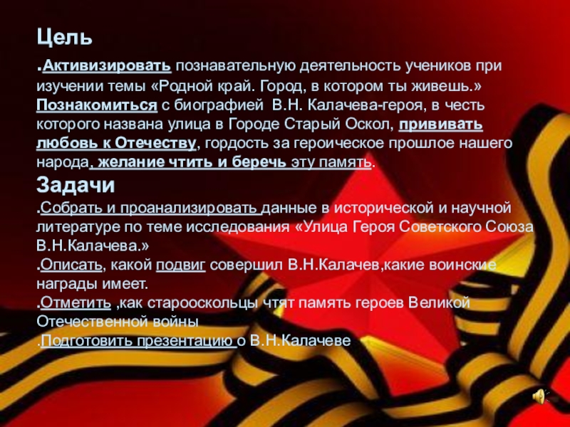 котором ты живешь.» Познакомиться с биографией В.Н. Калачева-героя, в честь которого названа улица в Городе Старый Оскол, прививать любовь к Отечеству, гордость за героическое прошлое нашего народа, желание чтить и беречь эту память.