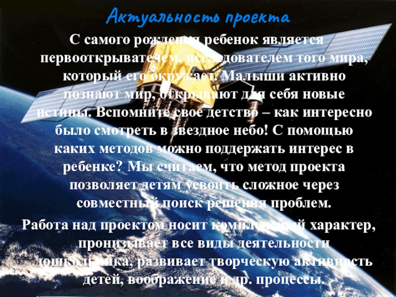 Современные дошкольники задают много вопросов о космосе, звездах, космонавтах, т.к. данная тема, как все неведомое, непонятное, недоступное глазу, будоражит детскую фантазию. Данный проект поможет детям научиться добывать информацию из различных источников, систематизировать полученные знания, применять их в различных видах детской деятельности