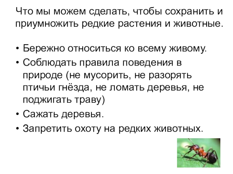 Соблюдать правила поведения в природе (не мусорить, не разорять птичьи гнёзда, не ломать деревья, не поджигать траву)