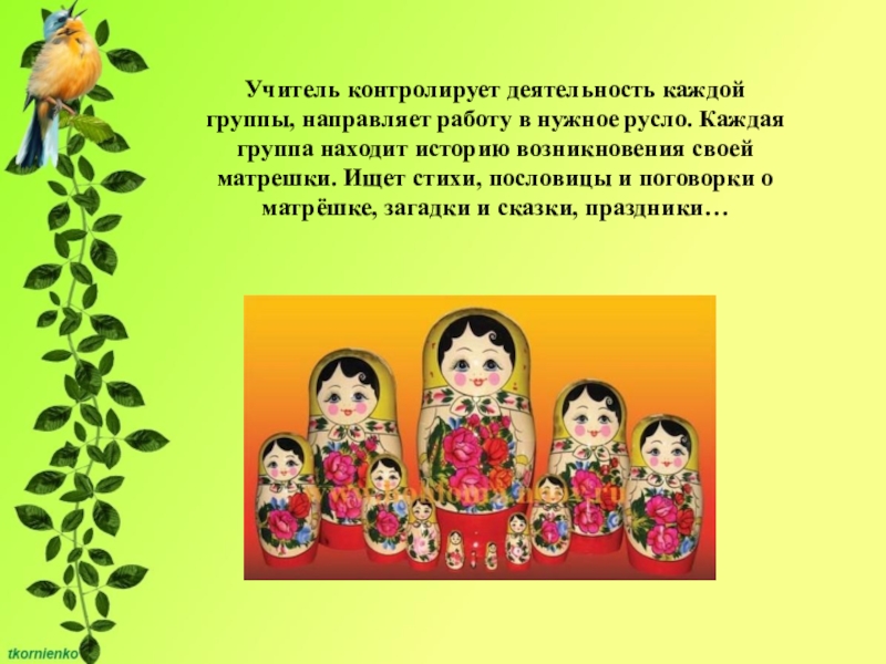 Учитель контролирует деятельность каждой группы, направляет работу в нужное русло. Каждая группа находит историю возникновения своей матрешки. Ищет стихи, пословицы и поговорки о матрёшке, загадки и сказки, праздники…