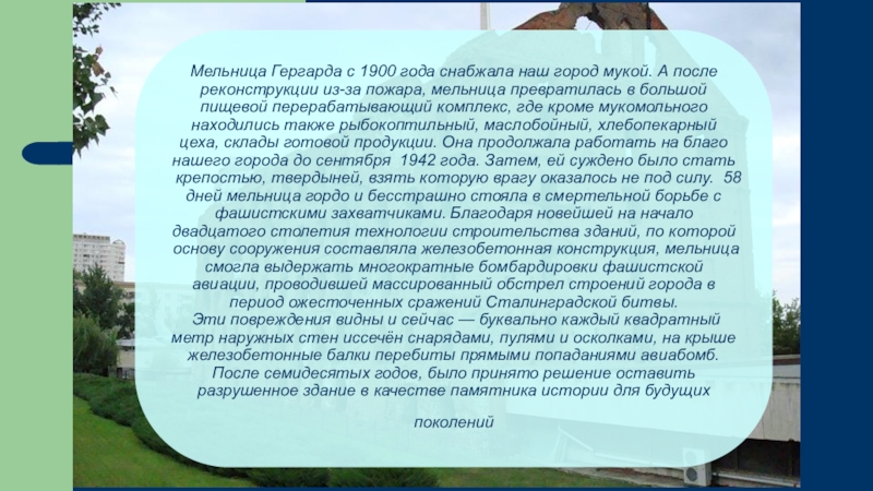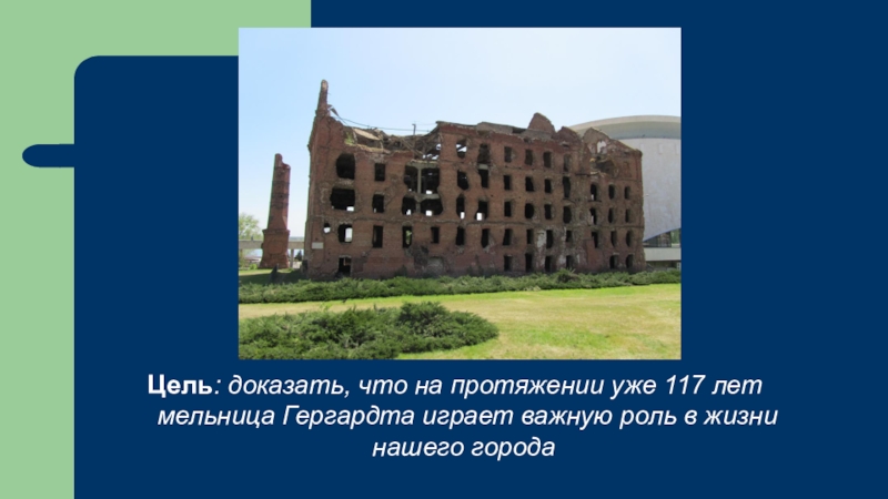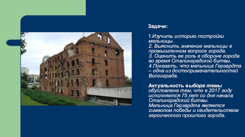 значение мельницы в промышленном вопросе города. 3. Оценить ее роль в обороне города во время Сталинградской битвы. 4.Показать, что мельница Гергардта – одна из достопримечательностей Волгограда. Актуальность выбора темы обусловлена тем, что в 2017 году исполняется 75 лет со дня начала Сталинградской битвы. Мельница Гергардта является символом победы и свидетельством героического прошлого города.
