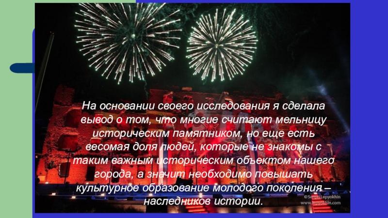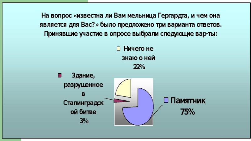 считают мельницу историческим памятником, но еще есть весомая доля людей, которые не знакомы с таким важным историческим объектом нашего города, а значит необходимо повышать культурное образование молодого поколения – наследников истории.
