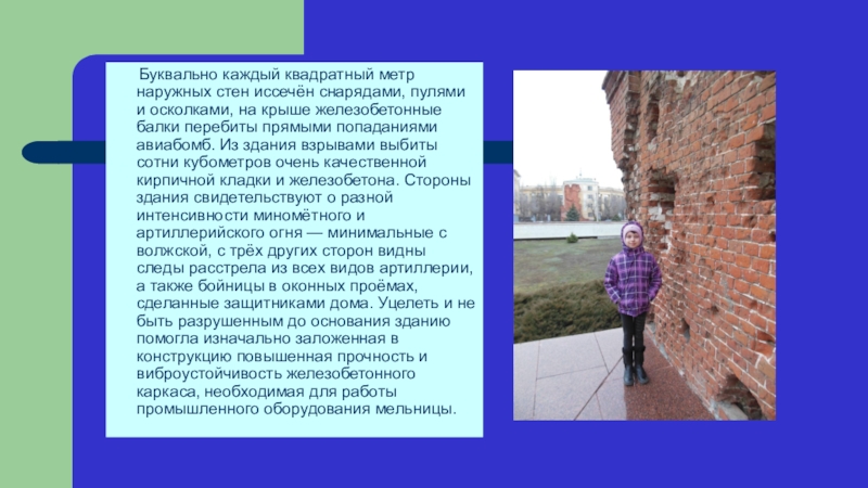 Слайд 5 Буквально каждый квадратный метр наружных стен иссечён снарядами,
