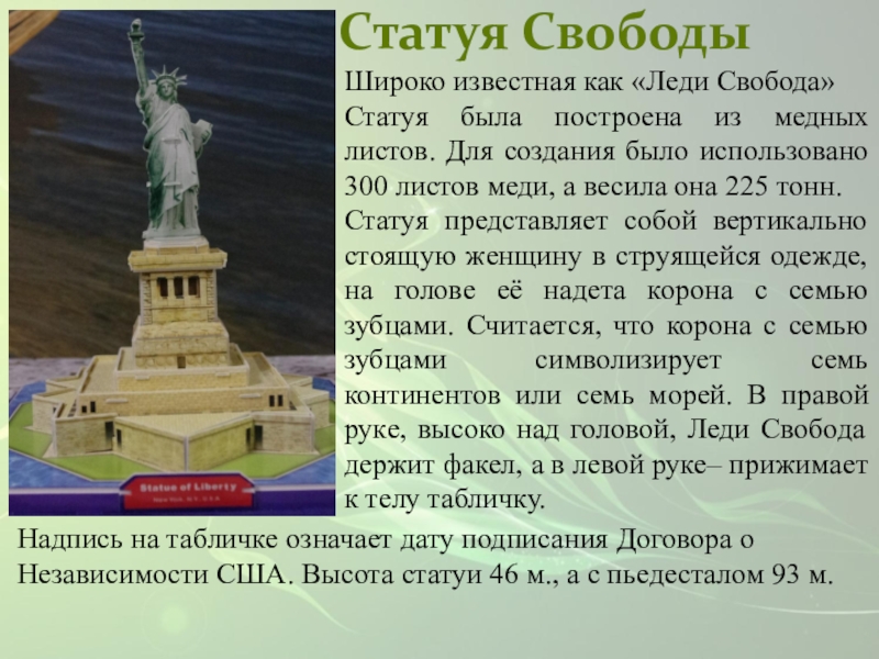 Надпись на табличке означает дату подписания Договора о Независимости США. Высота статуи 46 м., а с пьедесталом 93 м.
