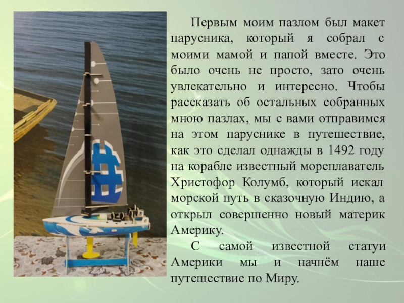 мамой и папой вместе. Это было очень не просто, зато очень увлекательно и интересно. Чтобы рассказать об остальных собранных мною пазлах, мы с вами отправимся на этом паруснике в путешествие, как это сделал однажды в 1492 году на корабле известный мореплаватель Христофор Колумб, который искал морской путь в сказочную Индию, а открыл совершенно новый материк Америку.