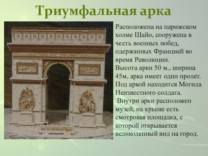 Расположена на парижском холме Шайо, сооружена в честь военных побед,