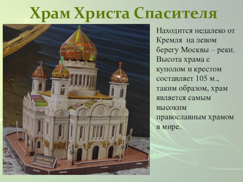 реки. Высота храма с куполом и крестом составляет 105 м., таким образом, храм является самым высоким православным храмом в мире.