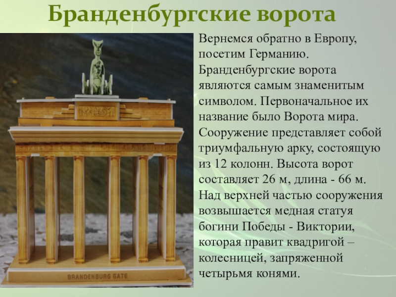 знаменитым символом. Первоначальное их название было Ворота мира. Сооружение представляет собой триумфальную арку, состоящую из 12 колонн. Высота ворот составляет 26 м, длина - 66 м. Над верхней частью сооружения возвышается медная статуя богини Победы - Виктории, которая правит квадригой – колесницей, запряженной четырьмя конями.