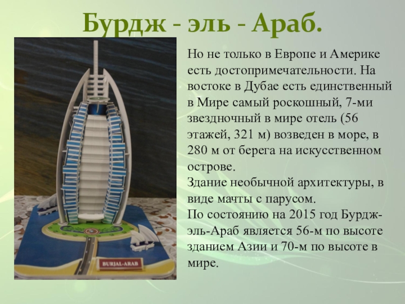 есть достопримечательности. На востоке в Дубае есть единственный в Мире самый роскошный, 7-ми звездночный в мире отель (56 этажей, 321 м) возведен в море, в 280 м от берега на искусственном острове.