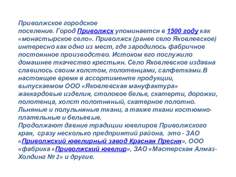 Слайд 8Приволжское городское поселение. Город Приволжск упоминается в 1500 году как «монастырское село». Приволжск (ранее село Яковлевское) интересно