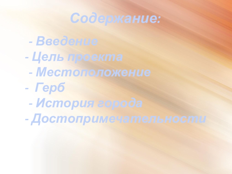 Содержание:- Введение Цель проекта- Местоположение  Герб- История города Достопримечательности