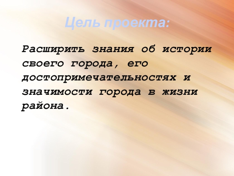 Цель проекта:Расширить знания об истории своего города, его достопримечательностях и значимости города в жизни района.