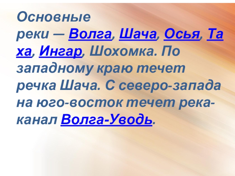 Слайд 6Основные реки — Волга, Шача, Осья, Таха, Ингар, Шохомка. По западному краю течет речка Шача. С северо-запада