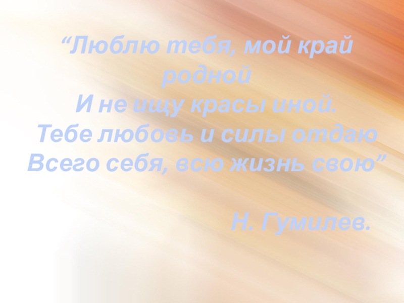 “Люблю тебя, мой край родной И не ищу красы иной. Тебе любовь и силы отдаю Всего себя,