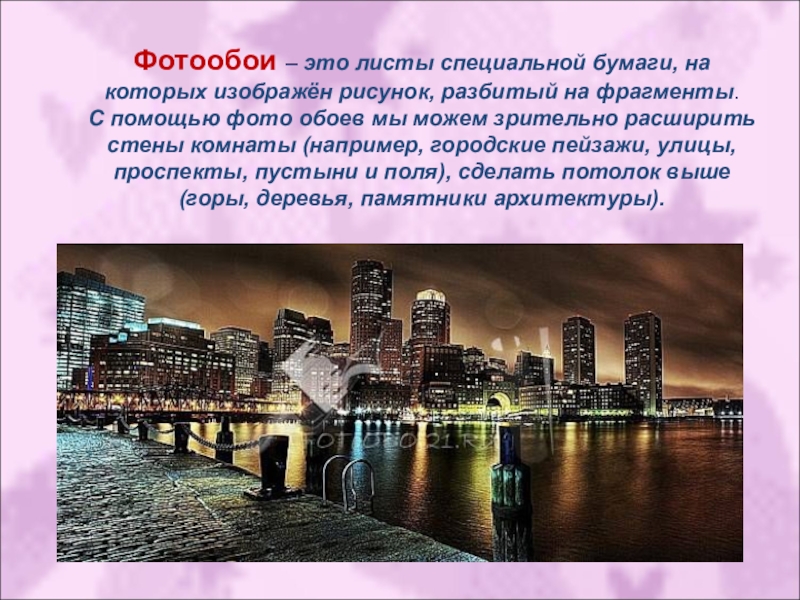 Слайд 8Фотообои – это листы специальной бумаги, на которых изображён рисунок, разбитый
