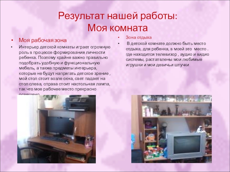 Поэтому в своей работе я хотела рассмотреть один из вариантов организации жилого пространства :мою комнату.