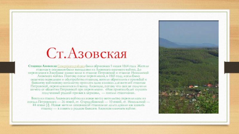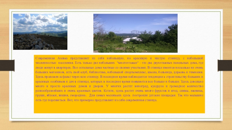Слайд 8Современная Азовка представляет из себя небольшую, но красивую и чистую станицу,