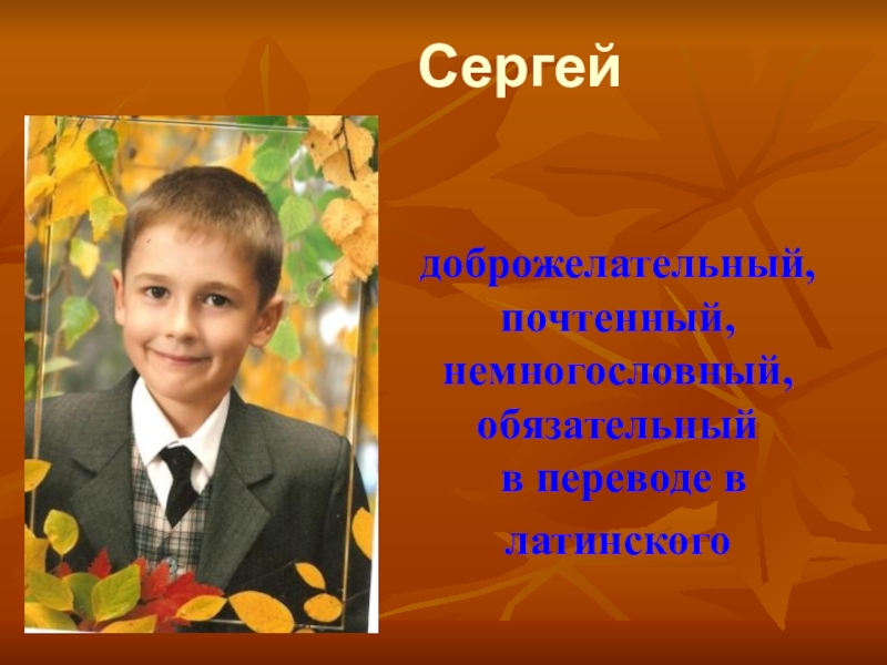 доброжелательный,почтенный, немногословный, обязательный  в переводе в латинского     Сергей