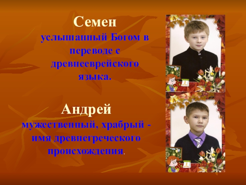 Семенуслышанный Богом в переводе с древнееврейского языка.Андреймужественный, храбрый - имя древнегреческого происхождения.