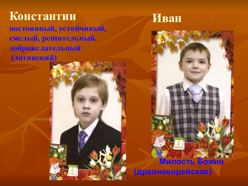 Константинпостоянный, устойчивый, смелый, решительный, доброжелательный (латинский)Иван      Милость Божия (древнееврейское)