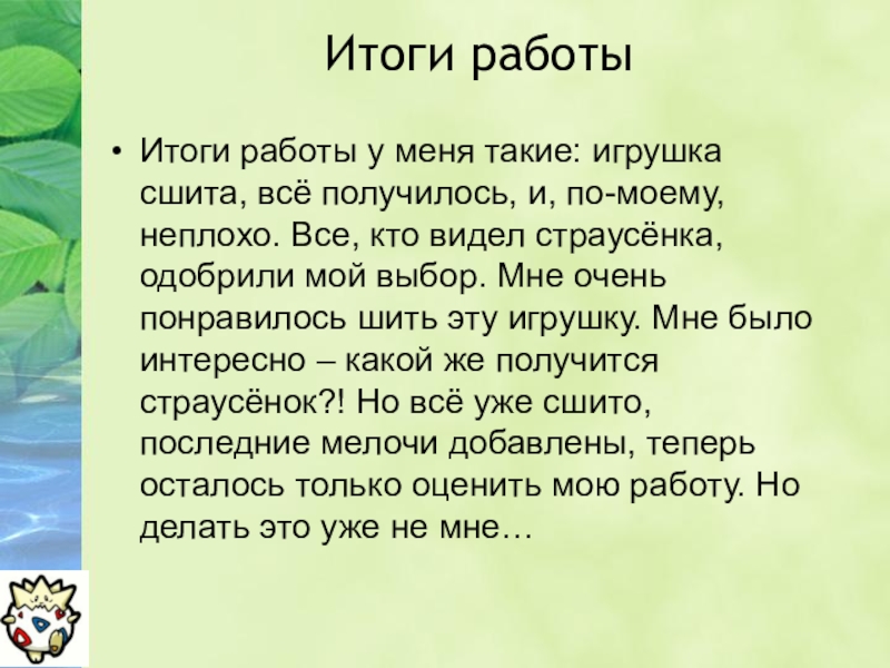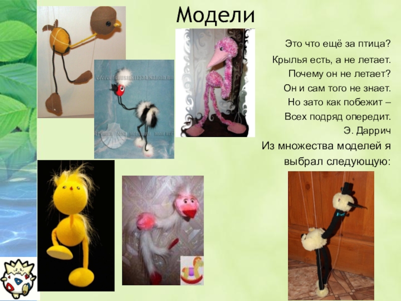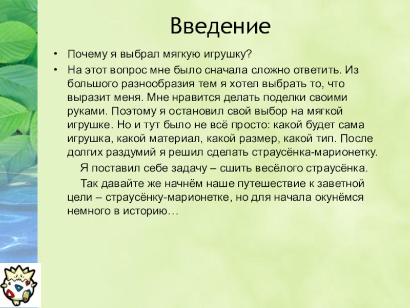 ответить. Из большого разнообразия тем я хотел выбрать то, что выразит меня. Мне нравится делать поделки своими руками. Поэтому я остановил свой выбор на мягкой игрушке. Но и тут было не всё просто: какой будет сама игрушка, какой материал, какой размер, какой тип. После долгих раздумий я решил сделать страусёнка-марионетку.