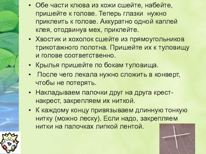 Хвостик и хохолок сшейте из прямоугольников трикотажного полотна. Пришейте их к туловищу и голове соответственно.