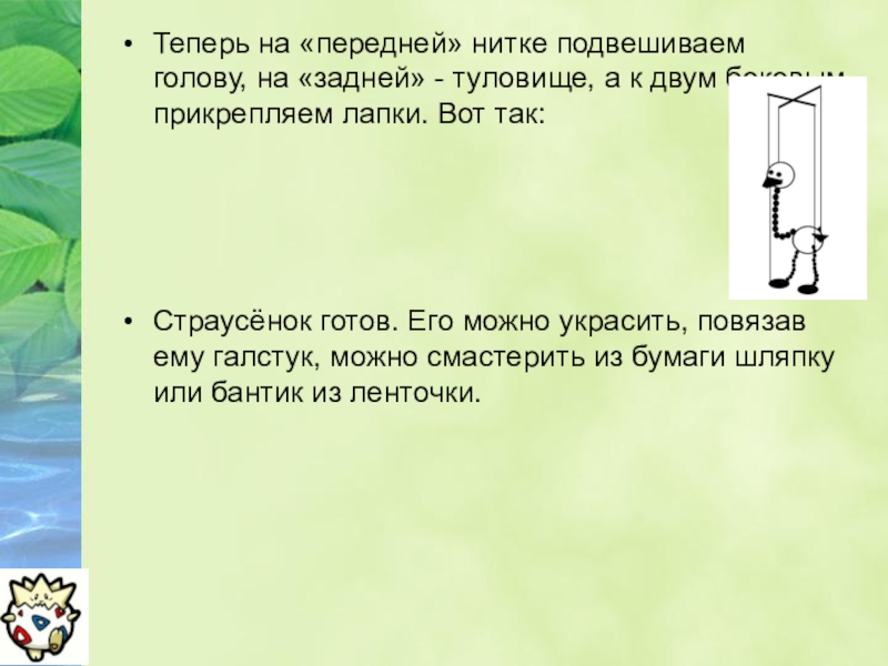 Теперь на «передней» нитке подвешиваем голову, на «задней» - туловище, а